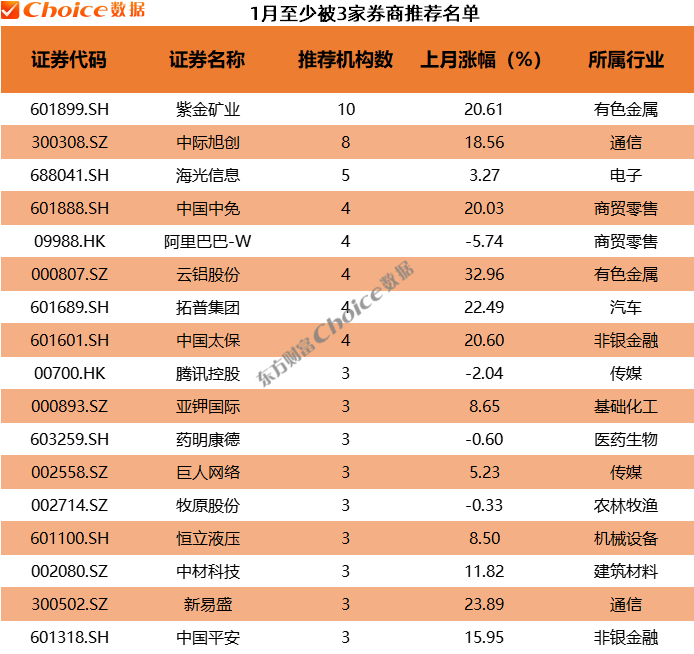 至少被3家以上券商同时推荐的金股有17只。其中,紫金矿业被10家券商推荐,包括国泰海通、招商证券、国信证券等.此外,中际旭创被8家券商推荐,海光信息被5家券商推荐,阿里巴巴-W、中国中免、云铝股份等被4家券商推荐。