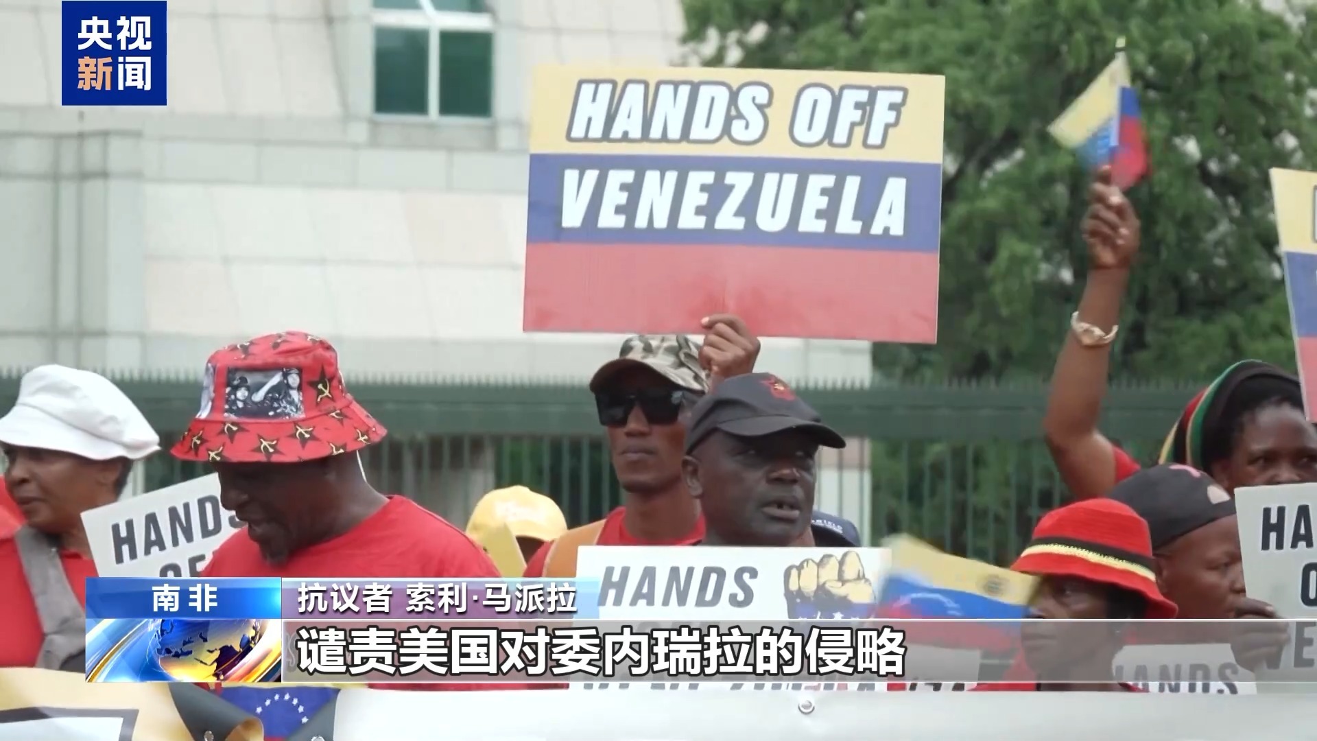 当地时间8日,南非民众在美国驻南非大使馆门口发起抗议,谴责美国袭击委内瑞拉,要求美国释放被强行控制的委内瑞拉总统马杜罗及其夫人。